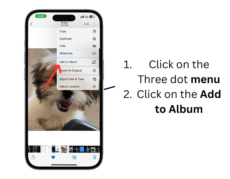 - 3단계: 앨범에 이미지를 추가하고 싶다고 가정해 보겠습니다. 이미지를 선택하고 점 3개 메뉴를 클릭한 다음 앨범에 추가를 선택하여 앨범에 사진을 추가합니다.
