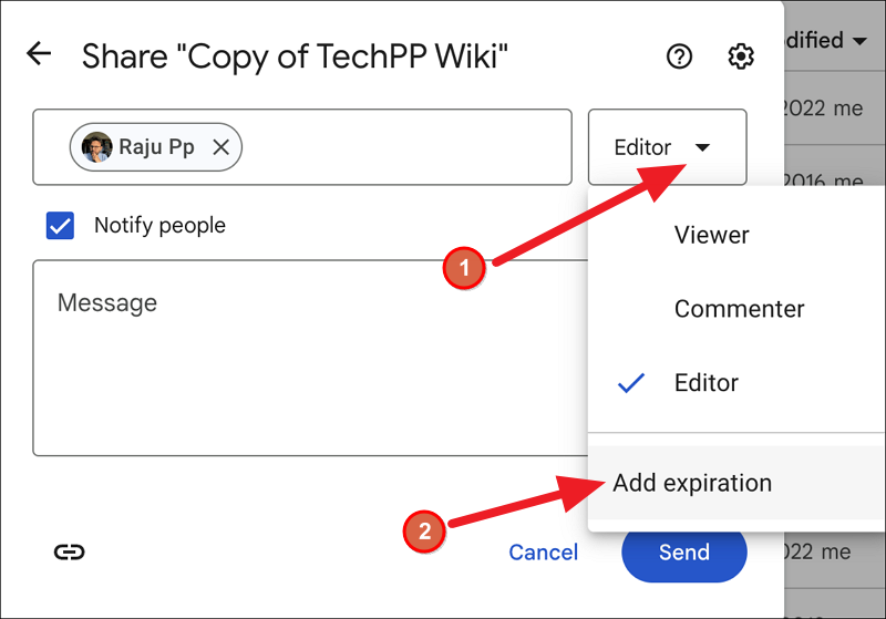 이제 연락처 또는 이메일 주소 옆에 있는 드롭다운 아이콘(역할 표시)을 클릭하고 만료 추가를 선택합니다