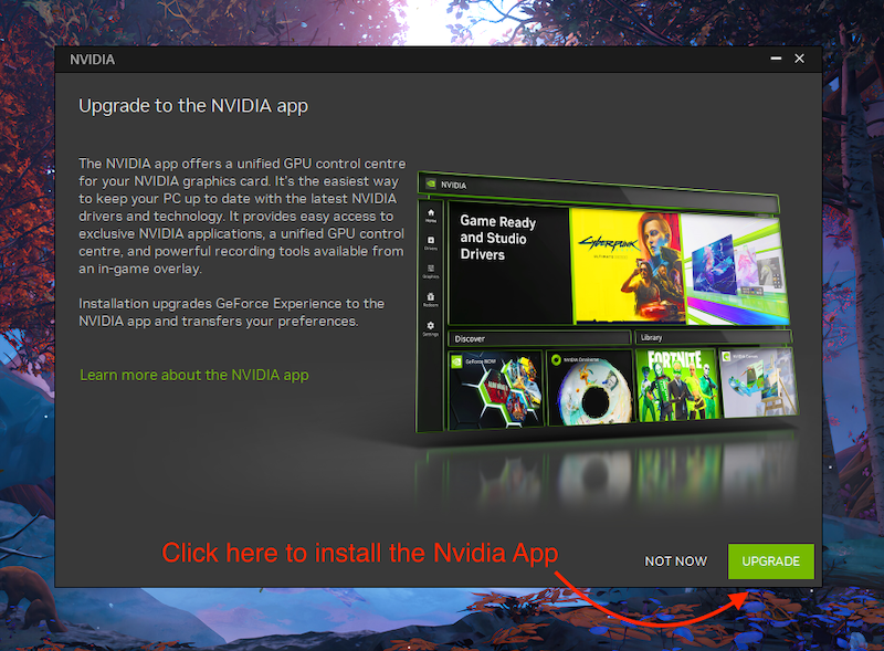 - 앱에서 Nvidia 앱으로 업그레이드하라는 메시지를 표시합니다. UPGRADE 버튼을 클릭하면 곧바로 드라이버 설치 페이지로 이동하게 됩니다.