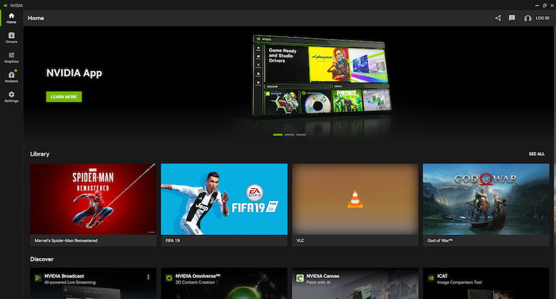 Nvidia GeForce Experience 및 Control Panel과 달리 새로운 Nvidia 앱은 현대적으로 보이며 기존 앱의 기능을 결합합니다. Nvidia는 앱 재설계에 매우 미니멀한 접근 방식을 취했습니다. 앱은 이전 색상 테마를 유지하지만 모든 것이 왼쪽 창에 분류됩니다. 홈 화면에는 게임과 앱 라이브러리가 있고 그 아래에는 Discover 피드가 있습니다.