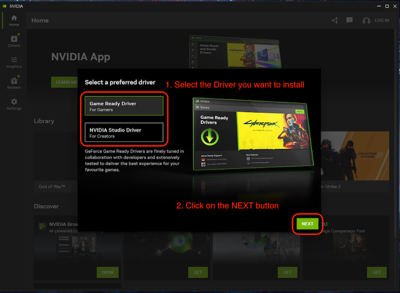 - 드라이버 설치 페이지에서 기본 드라이버를 설치하라는 메시지가 앱에 표시됩니다. 설치하려는 드라이버를 선택하고 NEXT(다음) 버튼을 클릭합니다