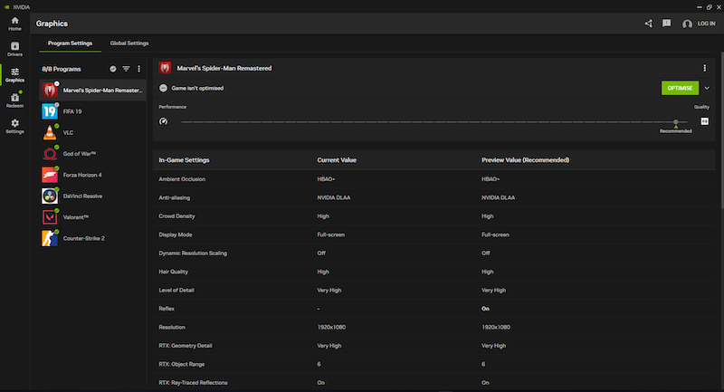 또한 프로그램 설정과 전역 설정을 위한 별도의 탭이 있어 게임 경험을 향상시키기 위해 모든 게임에 AI Upscaling 및 Dynamic Vibrance 와 같은 설정을 쉽게 적용할 수 있습니다