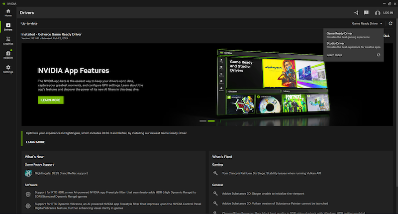 또 다른 좋은 점은 이제 드라이버 섹션에서 엔비디아 Game Ready 드라이버와 Studio Ready 드라이버 중에서 직접 선택할 수 있다는 점입니다. 이는 작은 변화처럼 보일 수 있지만 전환이 훨씬 쉬워집니다.
