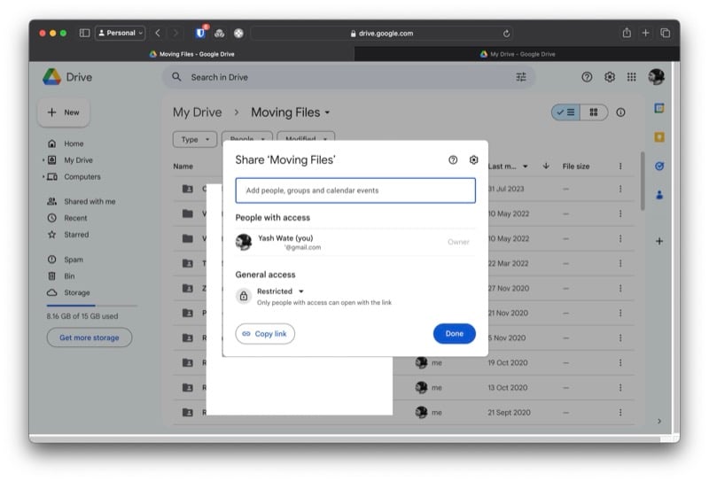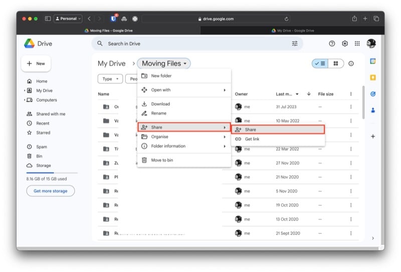 원하는 모든 파일을 새 폴더로 이동한 후 다음 단계는 이 폴더에 대한 공유를 설정하는 것입니다. 이는 다른 계정에 새 폴더의 모든 파일에 대한 액세스 권한을 부여하는 것입니다. 수행해야 할 작업은 다음과 같습니다.