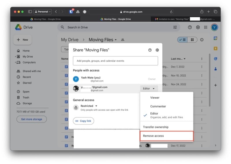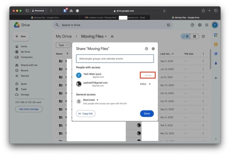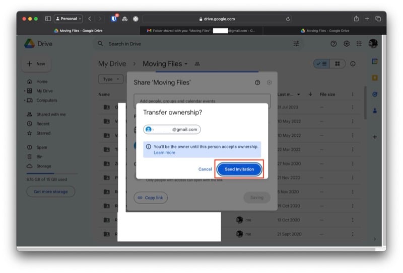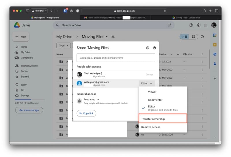 초대를 수락하고 수신자 계정의 새 드라이브 폴더에 액세스하면 해당 내용이 발신자 계정에 반영됩니다. 이제 다음 단계는 이 폴더의 소유권을 보낸 사람 계정에서 받는 사람 계정으로 변경하는 것입니다. 수행 방법은 다음과 같습니다.