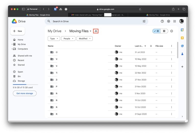 - 드라이브로 이동하여 공유 폴더를 열고 폴더 이름 옆에 있는 공유 아이콘을 클릭하세요. 이제 이름 바로 옆에 소유자 태그가 표시되어 전송이 성공했음을 확인합니다.