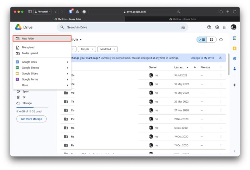 - 왼쪽 사이드바에서 새로 만들기 버튼을 클릭 하고 새 폴더 를 선택합니다