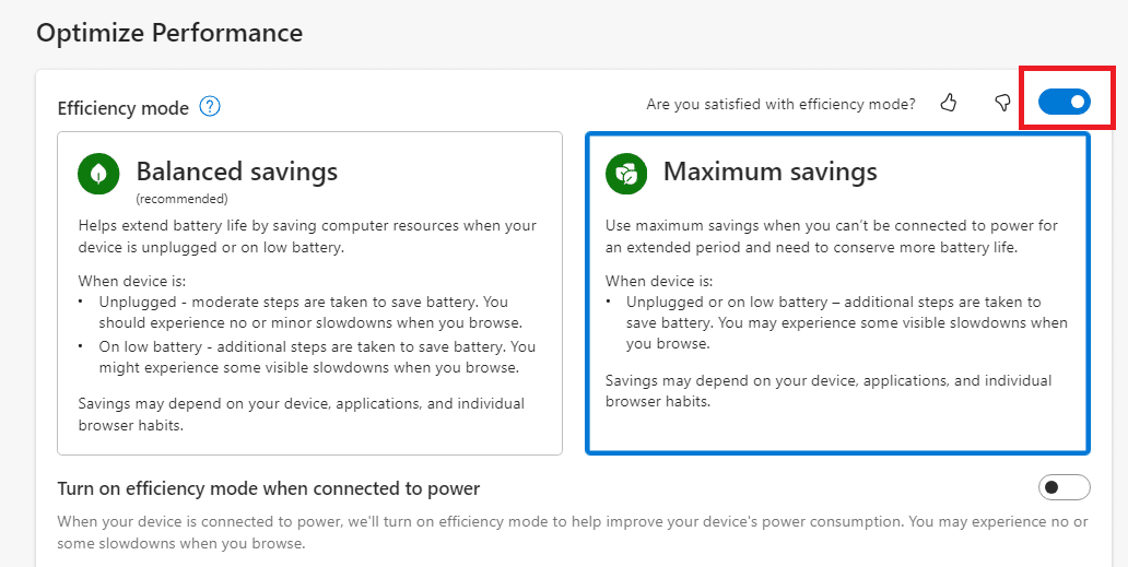 - 효율성 모드 옵션 옆에 있는 토글을 클릭하세요