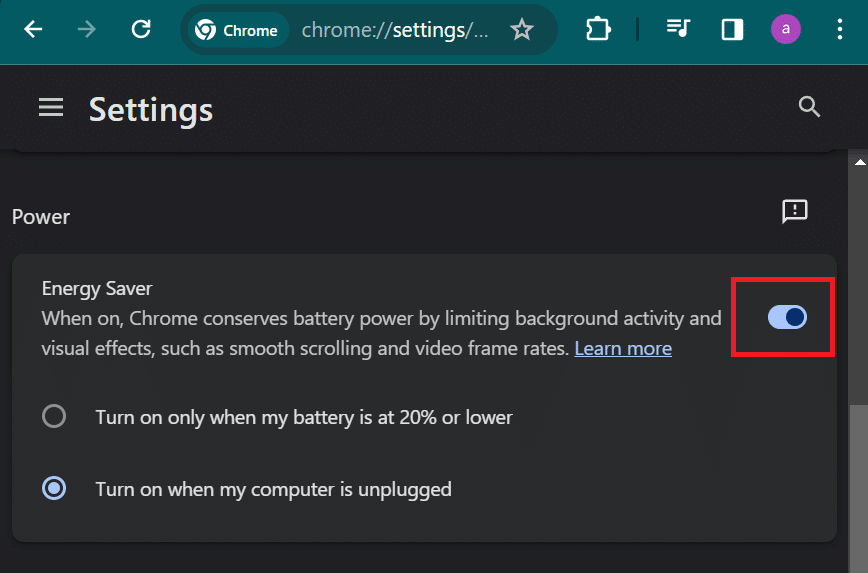 5. 브라우저에서 에너지 절약 기능을 비활성화합니다.