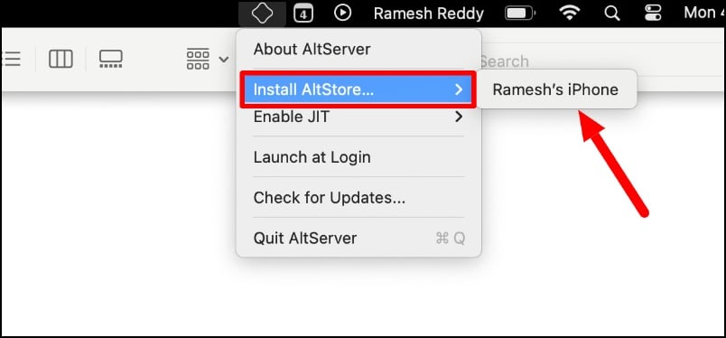 - 5단계: 이제 iPhone을 Mac에 연결하세요. 상단의 AltServer 아이콘을 클릭 하고 Alts 설치 스토어를 클릭한 후 설치하려는 iPhone을 선택하세요. iPhone에서 신뢰를 클릭합니다 몇 초 후에 Altstore가 iPhone에 설치되기 시작합니다.