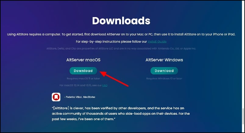 - 2단계: Mac 또는 Windows용 AltServer를 다운로드합니다 이 경우 Mac용으로 다운로드하고 있습니다.