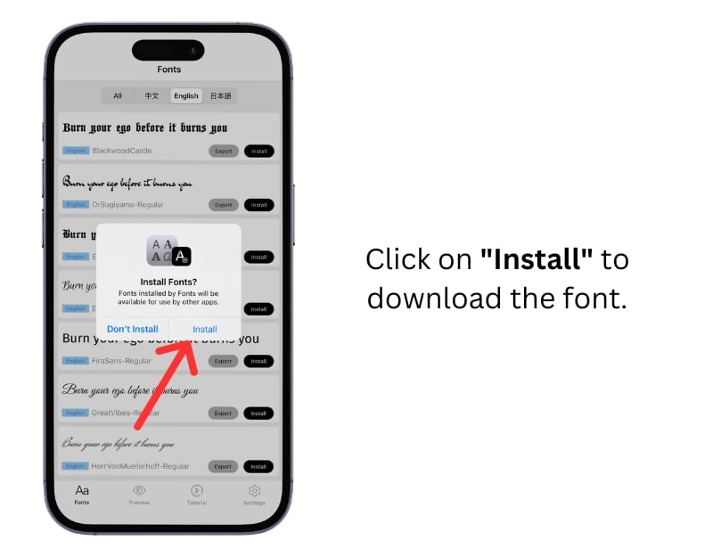- 3단계: 설치를 클릭 하고 설치를 확인하여 iPhone에 글꼴을 추가합니다. 이 프로세스는 사용 중인 모든 글꼴 앱과 유사합니다.