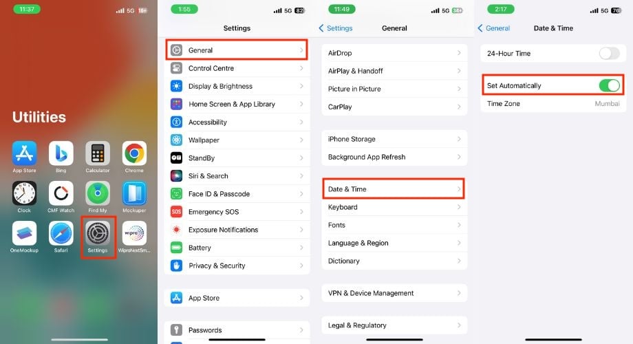 아이폰의 날짜 및 시간 설정을 확인하고 수정하면 iPhone 메시지 인덱싱 문제를 해결할 수 있습니다. 사소한 세부 사항처럼 보일 수도 있지만 많은 일을 할 수 있습니다. 메시지는 시스템 시계에 따라 달라지는 타임스탬프를 기준으로 인덱싱됩니다. 타임스탬프가 정확하지 않으면 인덱스의 검색 기능이 중단될 수 있습니다. 따라서 날짜와 시간이 정확해야 합니다. 아래 단계에 따라 동일한 작업을 수행하십시오.