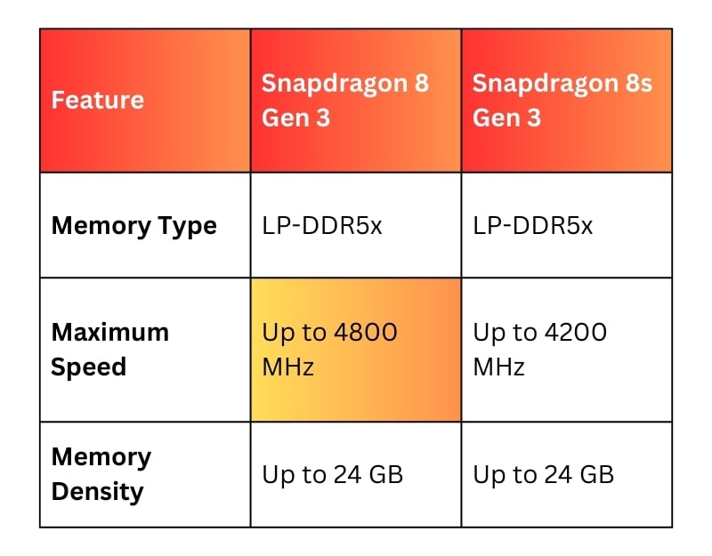 8세대 및 8s 3세대는 최대 24GB의 메모리 밀도로 최신 DDR5 기술을 지원합니다. 그러나 최대 속도는 8s Gen 3에서 더 낮습니다. 스냅드래곤 8 Gen 3는 최대 4800MHz의 더 높은 속도를 지원하는 반면 Snapdragon 8s Gen 3는 최대 4200MHz의 속도를 지원합니다.