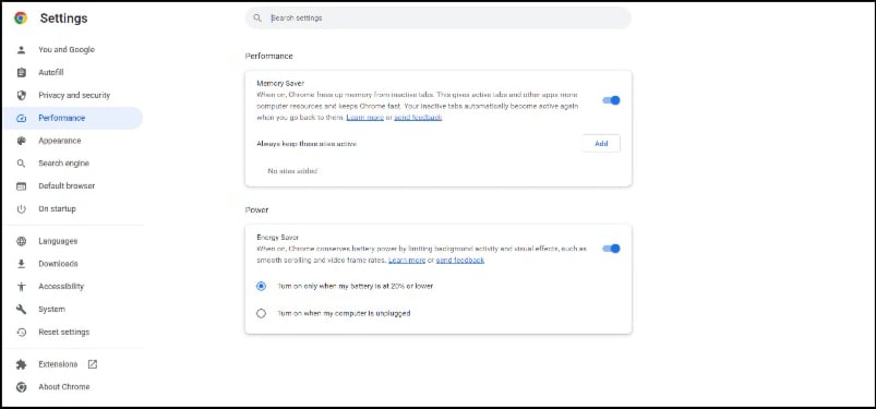 새로운 성능 기능의 메모리 절약 및 에너지 절약은 Google Chrome 버전 110 이상을 실행하는 장치에서 기본적으로 활성화됩니다. 점 3개 메뉴 → 추가 도구 → 성능 → 메모리 절약 및 에너지 절약 전환을 클릭하여 이 기능을 수동으로 활성화할 수도 있습니다. 또는 기본 설정 → 성능 탭으로 이동하여 찾을 수도 있습니다.
