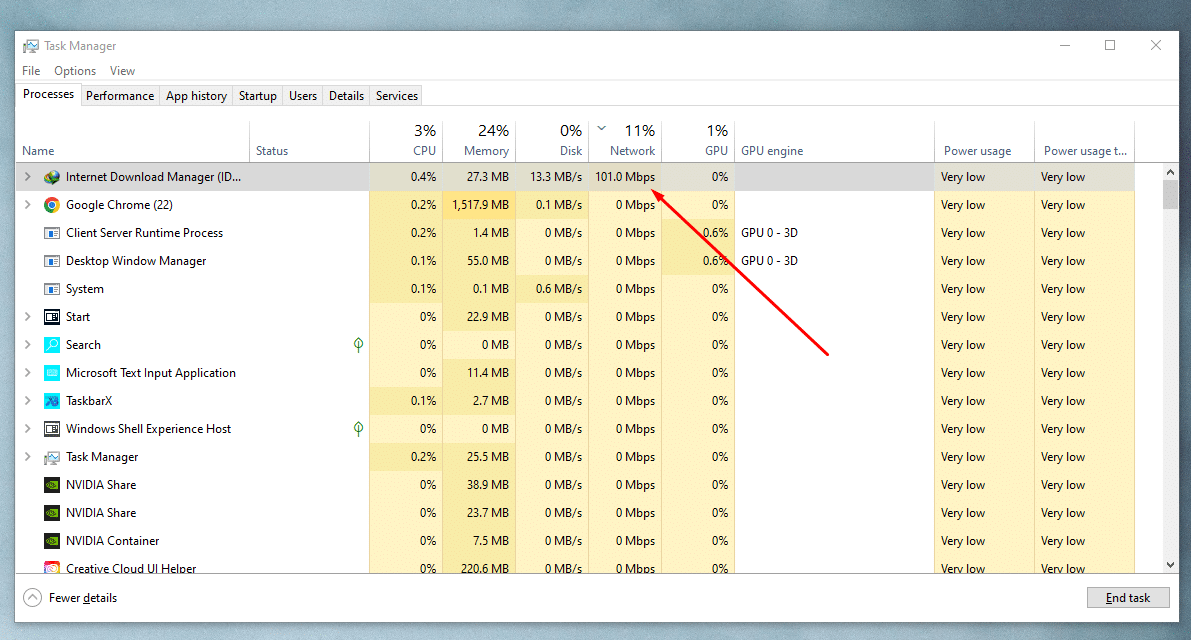 백그라운드 애플리케이션을 비활성화하려면 키보드 단축키 control+shift+esc를 사용하여 작업 관리자를 엽니다 다음으로 네트워크 탭 에서 마우스 오른쪽 버튼을 클릭하고 작업 끝내기 를 눌러 인터넷을 사용하는 모든 프로그램을 닫습니다