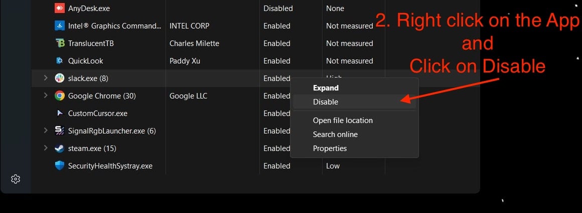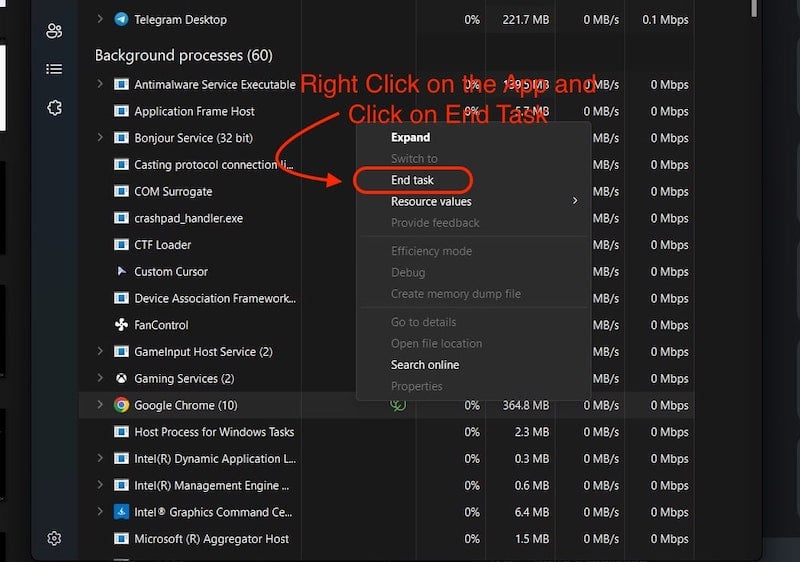 - 시스템 리소스를 너무 많이 사용하고 있는 앱을 선택하고 마우스 오른쪽 버튼을 클릭하세요.