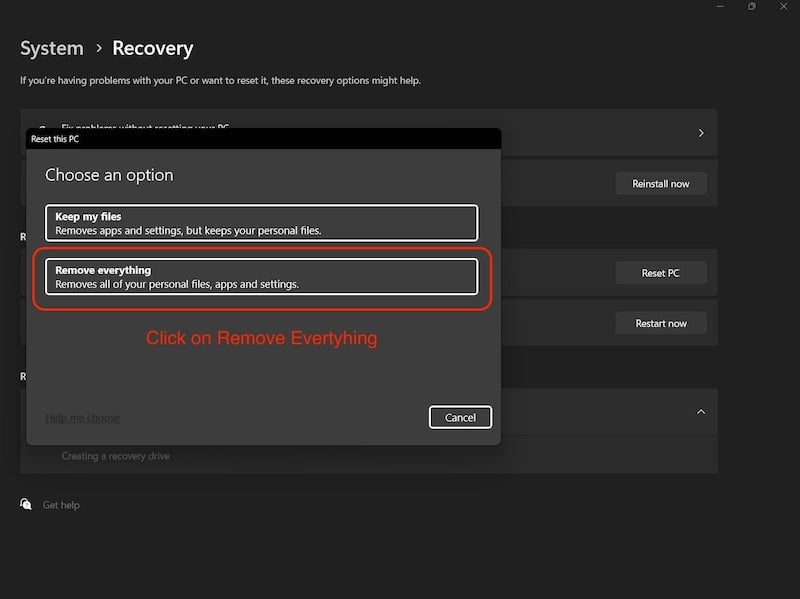 - 이제 모두 제거를 선택하십시오. 이 옵션은 개인 파일은 물론 앱 데이터 및 설정을 포함한 모든 항목을 제거합니다.