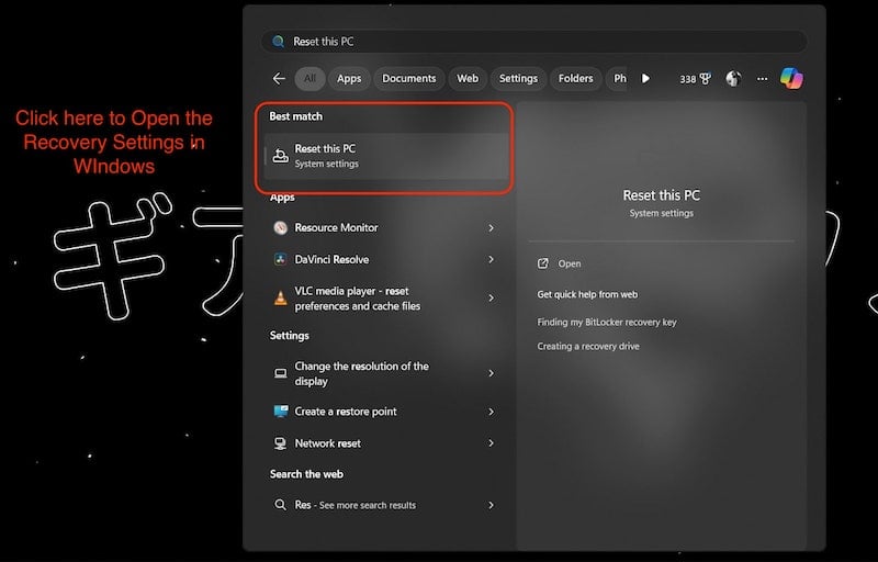 - Windows 키를 누르고 이 PC 재설정을 검색하세요.