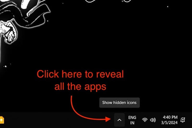 - 오른쪽 작업 표시줄에 위쪽을 가리키는 작은 화살표가 표시됩니다.