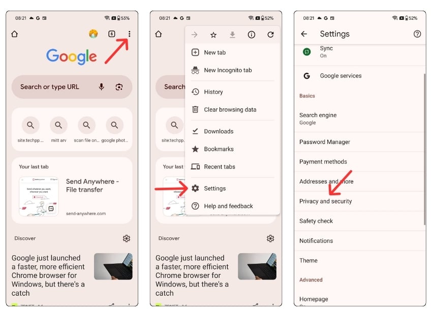 - 1단계: Chrome을 엽니다 . 오른쪽 상단 모서리에 있는 세 개의 점을 클릭하고 " 설정"을 클릭합니다. ”