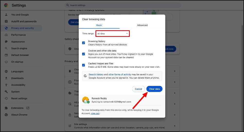 - 3단계: 더 나은 결과를 얻으려면 시간 범위를 전체 시간 으로 선택하세요 여기에 표시된 모든 상자를 선택하고 데이터 지우기를 클릭하십시오.