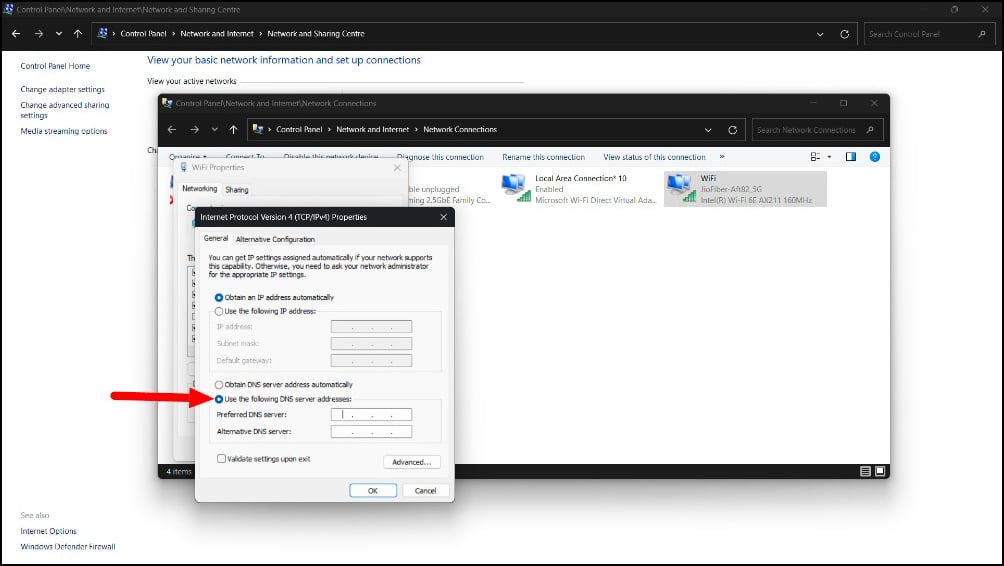 - 6단계: " 다음 DNS 서버 주소 사용 "을 선택 하고 DNS 서버 주소를 입력합니다(예: 기본 DNS에서는 Google DNS: 8.8.8.8 대체 DNS에서는 8.8.4.4 ).