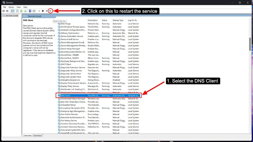 - 3단계: DNS 클라이언트를 선택 하고 서비스 다시 시작 버튼을 클릭합니다.