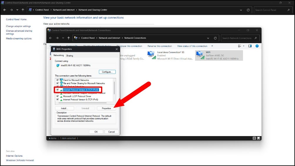 - 5단계: 인터넷 프로토콜 버전 4(TCP/IPv4)를 선택 하고 속성을 클릭합니다.