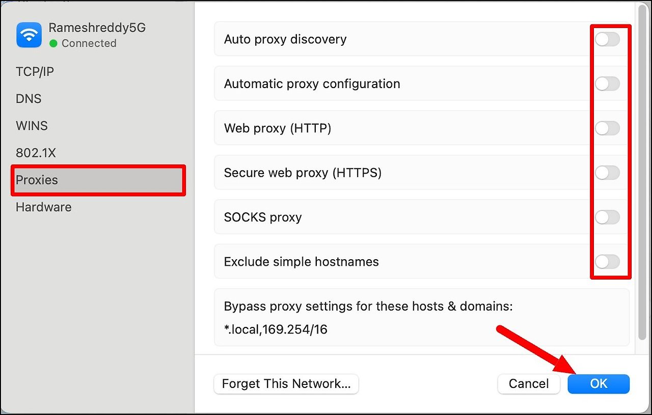 - 6단계: 모든 프록시를 끄고 확인을 클릭하세요 .