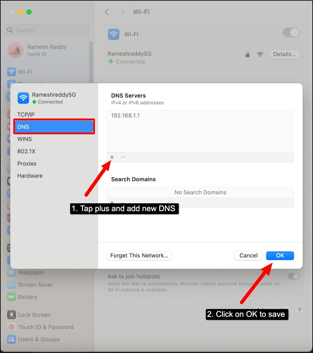 - 5단계: DNS 탭 으로 이동하여 “ + ” 버튼을 클릭하여 새 DNS 서버를 추가합니다. Google DNS를 추가할 수 있습니다: 8.8.8.8