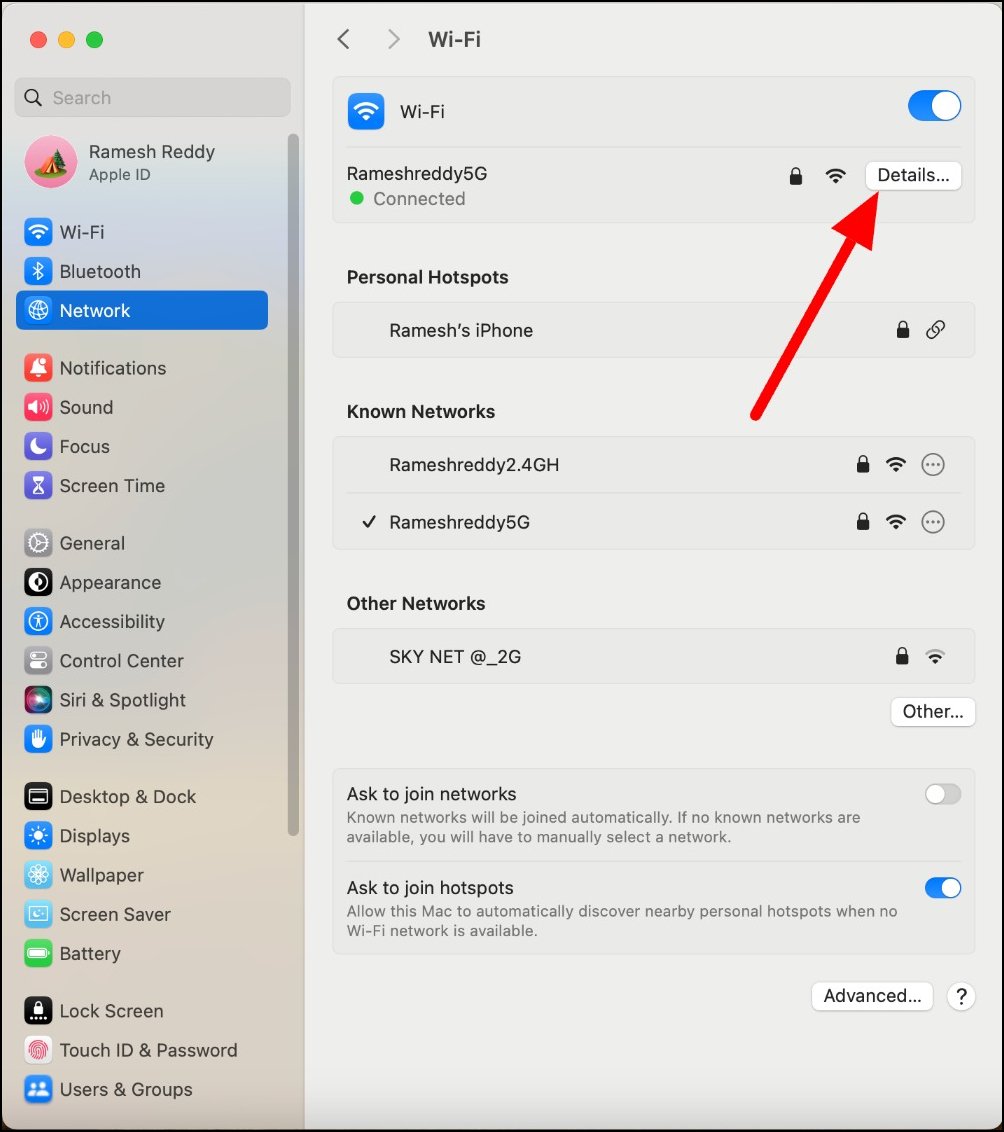 - 2단계: 연결된 Wi-Fi 네트워크에서 “ i ” 아이콘을 탭합니다.