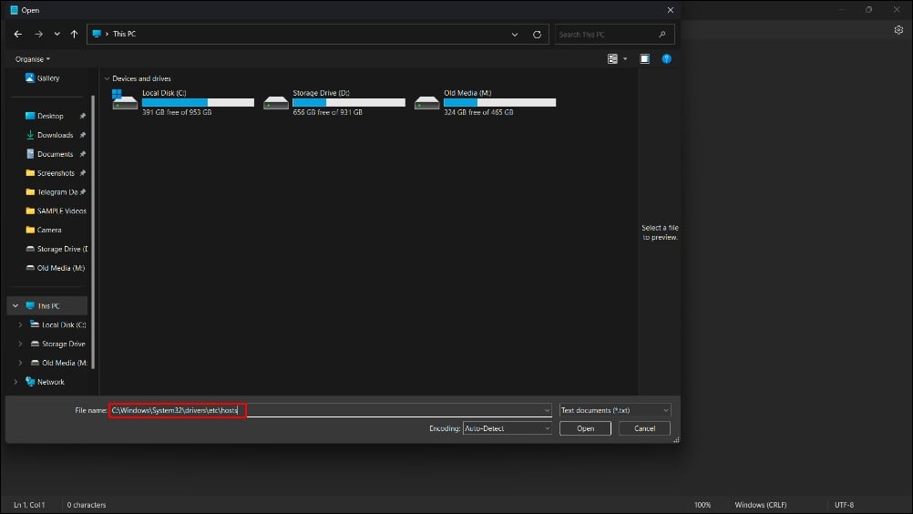 - 2단계: 파일 > 열기로 이동하여 C:\Windows\System32\drivers\etc로 이동합니다.