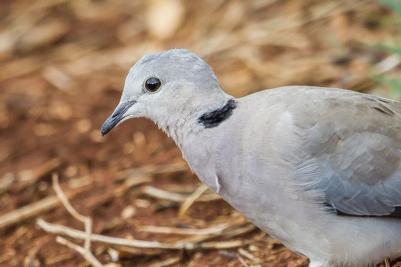 물리적 특성: 둔한 회색과 갈색의 깃털; 목덜미 주위의 검은색 칼라; 검은 눈과 부리; 돌연변이에는 흰색, 주황색, 얼룩무늬(고리목 비둘기)가 포함됩니다.