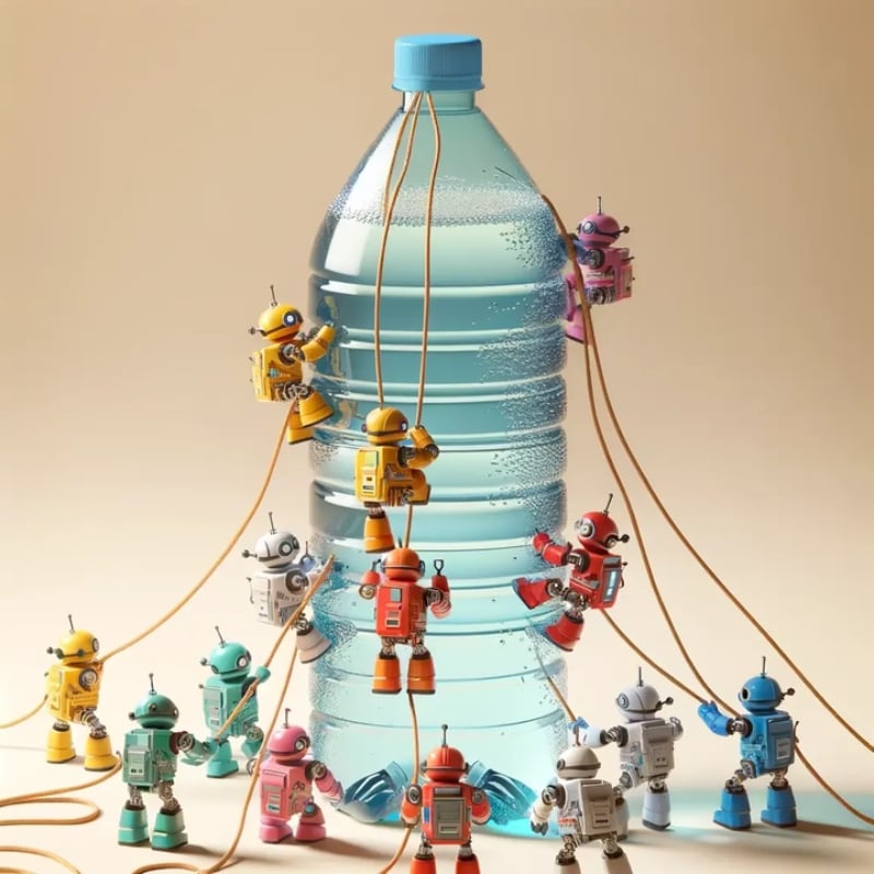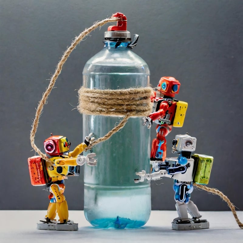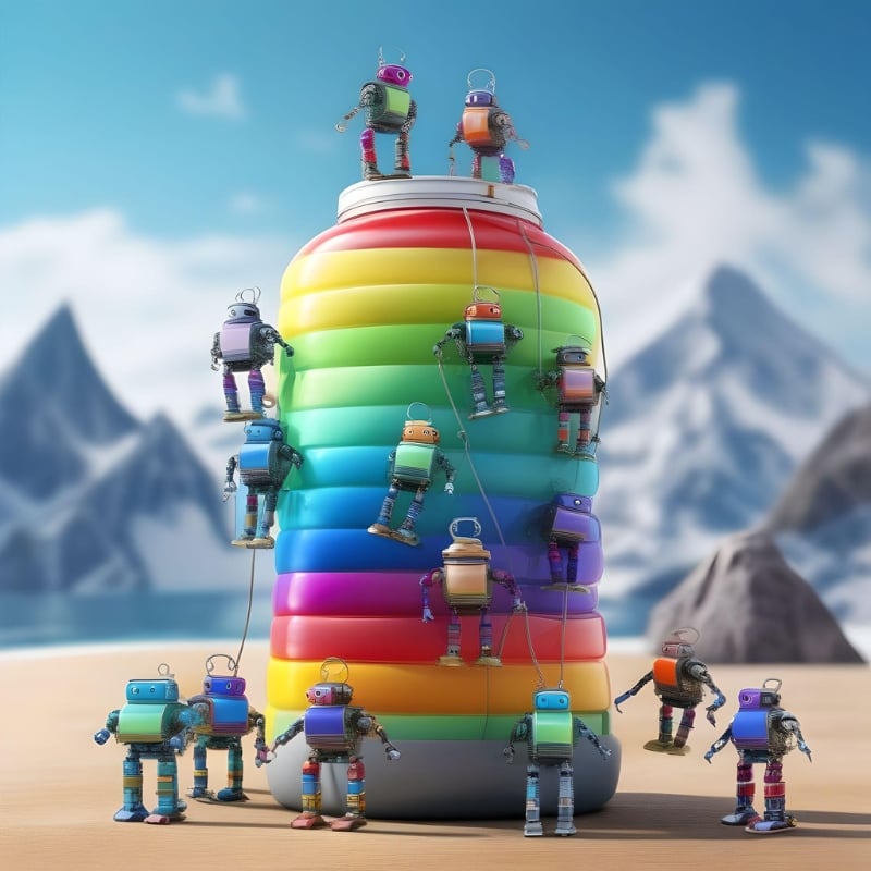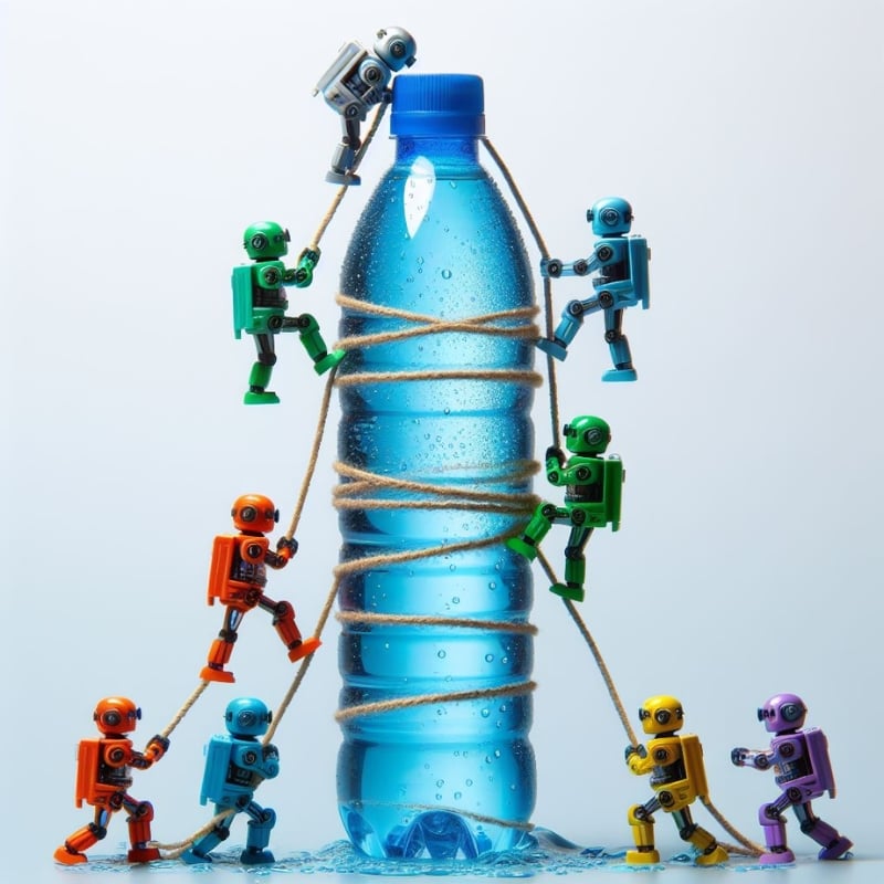 큰 물병을 오르려고 하는 소형 로봇(다양한 색상) 그룹입니다. 로봇들은 밧줄로 서로 묶여 있고, 서로 오르는 것을 돕고 있다.