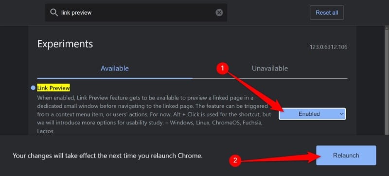- Chrome 검색창에 Link Preview를 입력하면 플래그가 표시됩니다.