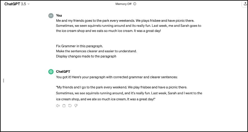 문법을 수정하기 위해 매번 프롬프트를 사용하고 싶지 않다면 동일한 대화를 사용하고 텍스트를 편집하면 됩니다. 처음으로 대화를 만들면 ChatGPT가 자동으로 새 대화 채팅을 만듭니다. 다음에 문법을 고치고 싶을 때, 동일한 채팅을 이용하여 텍스트를 입력하면 됩니다. ChatGPT는 사용자가 하려는 작업을 자동으로 기억하고 정보를 수정하여 표시합니다. 현재 및 향후의 모든 텍스트에 대해 ChatGPT에 이 작업을 수행하도록 요청할 수도 있습니다.