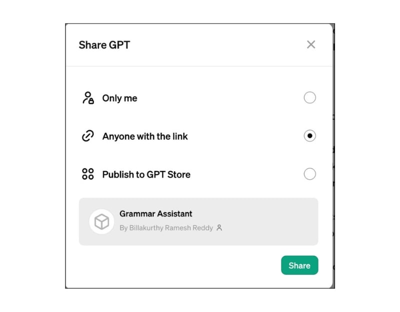 - 3단계: 이제 여기에 공유한 이전 텍스트 명령을 붙여넣고 저장을 클릭하세요. GPT를 공개적으로 저장하거나 GPT를 스토어에 게시할 수 있습니다.