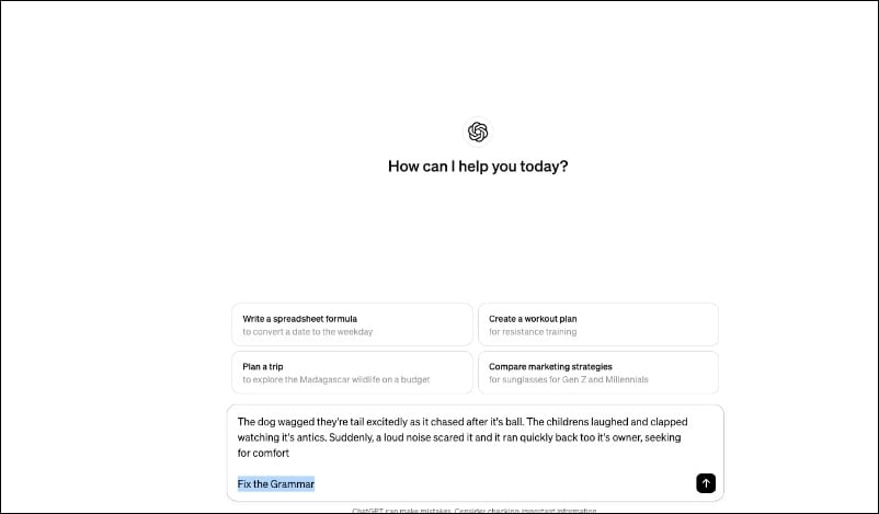 문장의 명확성은 문장을 더 투명하고 이해하기 쉽게 만드는 데 도움이 됩니다. 문장 명확성 기능은 ChatGPT 프리미엄 버전에서만 사용할 수 있지만 ChatGPT를 통해 무료로 얻을 수 있습니다. 문법을 수정하는 간단한 '문법 수정' 프롬프트를 추가하세요. 예를 들어 사용할 수 있는 텍스트 프롬프트는 다음과 같습니다.