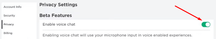 Roblox에서 음성 채팅이 실제로 활성화되어 있는지 확인해야 합니다. 그렇게 하려면 Roblox 웹사이트로 이동하여 설정을 열고 개인 정보 보호를 엽니다. 여기에서 음성 채팅 활성화 토글이 켜져 있는지 확인하세요.