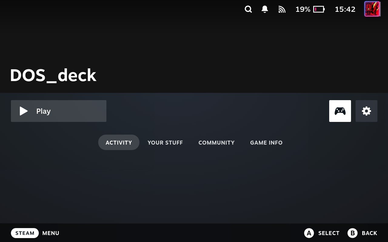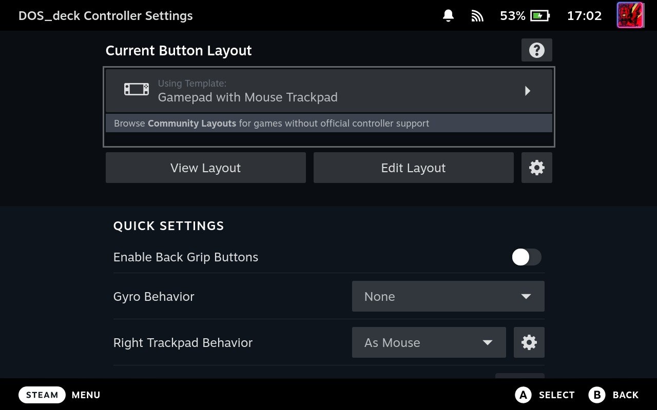 이제 끝났습니다! 게임 모드로 돌아가면(명확한 이름의 바탕 화면 바로 가기 또는 다시 시작으로 수행 가능) 모든 기능을 갖춘 DOS_deck 바로 가기를 갖게 됩니다! 이제 아래 그림과 같이 "마우스 트랙패드가 있는 게임패드"를 사용하도록 컨트롤러 설정을 변경하기만 하면 됩니다.