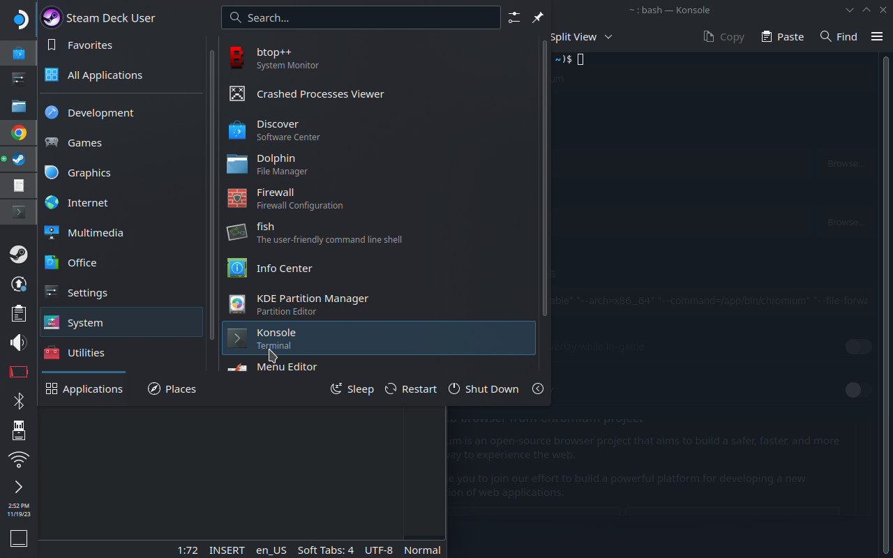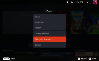내가 도달한 타협은? 대신 Chromium에 설치하세요! 시작하자. 먼저 , 게임 모드에서 Steam Deck 전원 버튼을 몇 초 동안 눌러 전원 메뉴를 실행하고 "데스크탑으로 전환"을 선택하세요.