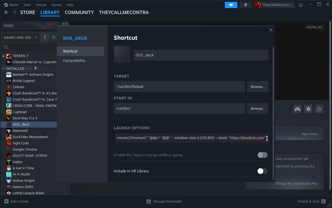 이제 Chromium용으로 만든 Steam 단축키를 찾으세요. 마우스 오른쪽 버튼을 클릭하고 "속성"을 선택한 다음 바로 가기 이름을 DOS_deck으로 바꿉니다. 다음으로 Chromium 실행 옵션 끝에 " --window-size=1200,800 --kiosk "https://dosdeck.com"을 입력하거나 붙여넣습니다 . 마지막 @@ 뒤에 공백을 추가합니다. 아래 그림.