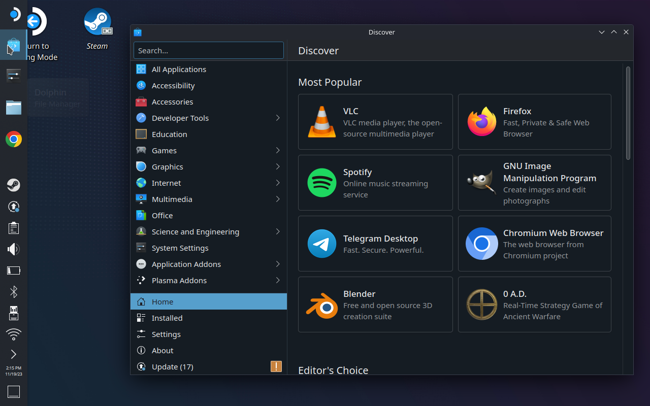 Steam OS 데스크탑 모드에 들어가면 기본적으로 시작 메뉴에 고정되어 있는 Discover App Store를 열고 싶을 것입니다. 데스크탑 모드에서는 Dock/USB 허브를 통해 연결된 키보드와 마우스를 사용하거나 X 버튼을 눌러 화면 키보드를 올릴 수 있습니다. 왼쪽 클릭은 오른쪽 트리거, 오른쪽 클릭은 왼쪽 트리거입니다.