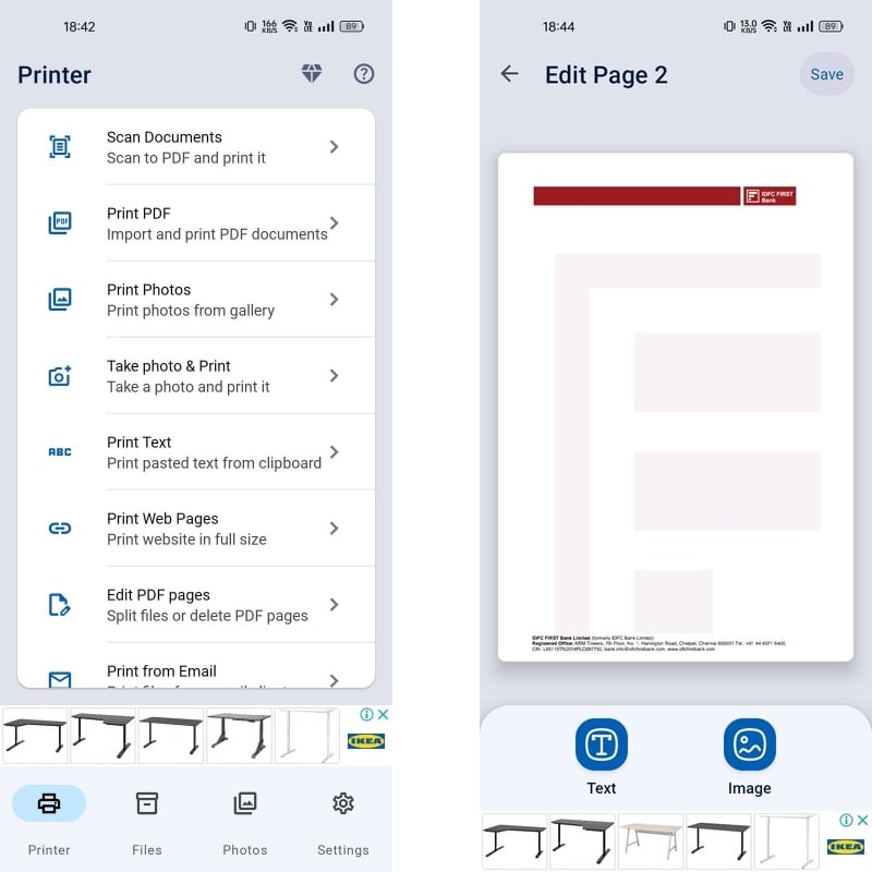 Airprint용 프린터는 문서를 제대로 인쇄하는 데 필요한 모든 기능을 갖추고 있기 때문에 목록에서 가장 다재다능한 응용 프로그램 중 하나입니다. 인쇄하기 전에 앱 자체에서 이미지와 PDF 문서를 편집할 수 있다는 점이 마음에 듭니다. 휴대폰에 있는 텍스트를 복사하여 프린터 앱의 내장 캔버스에 직접 붙여넣고 인쇄할 수 있는 옵션도 있습니다.