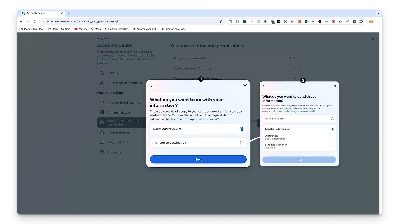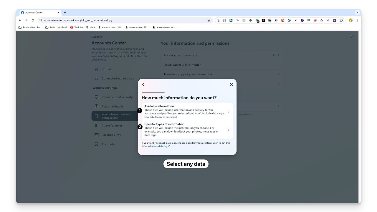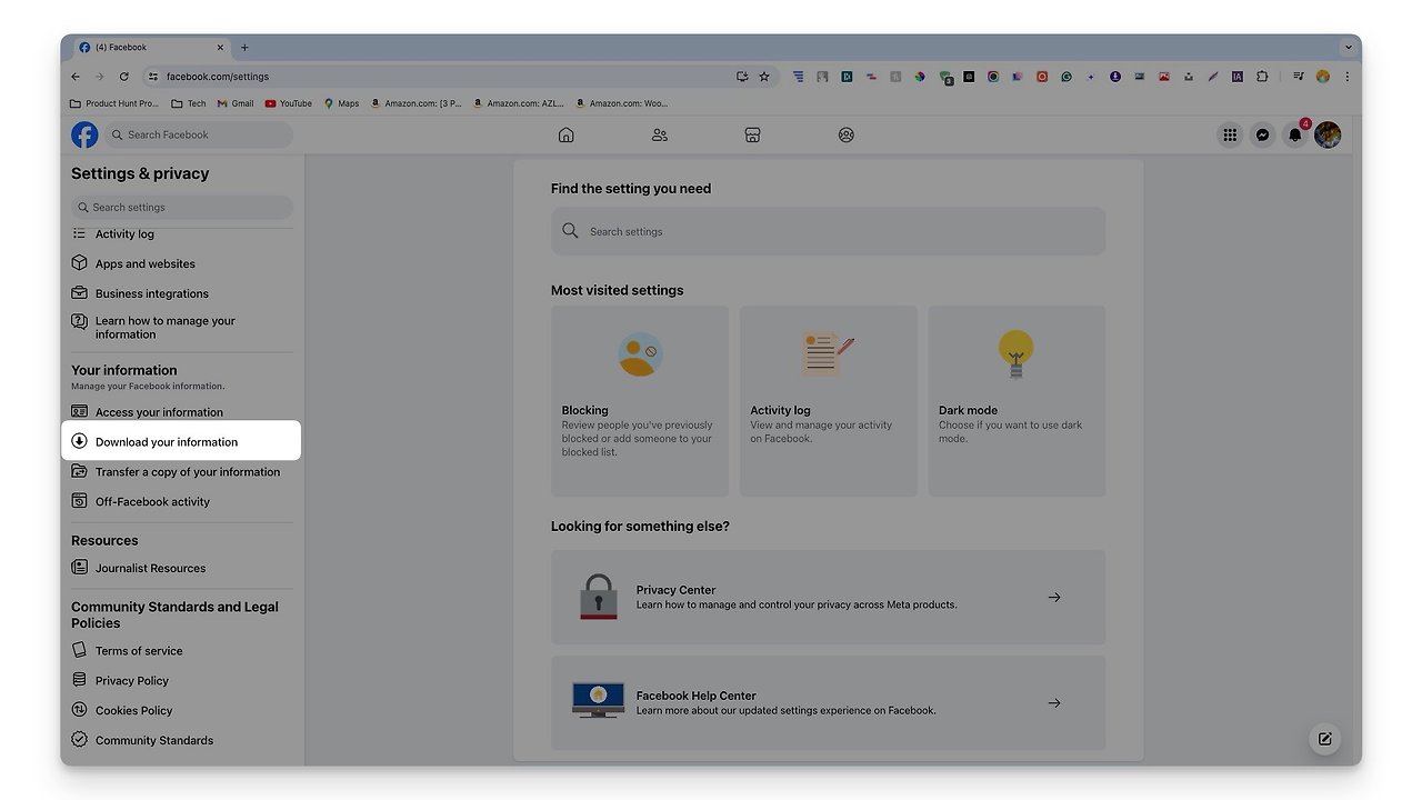 앱이나 웹사이트의 메타 계정 센터에서 페이스북 데이터를 다운로드할 수 있습니다. 웹이나 앱에서 Facebook 계정에 로그인한 후 설정에서 메타 계정 센터를 방문하여 모든 정보에 액세스하세요.