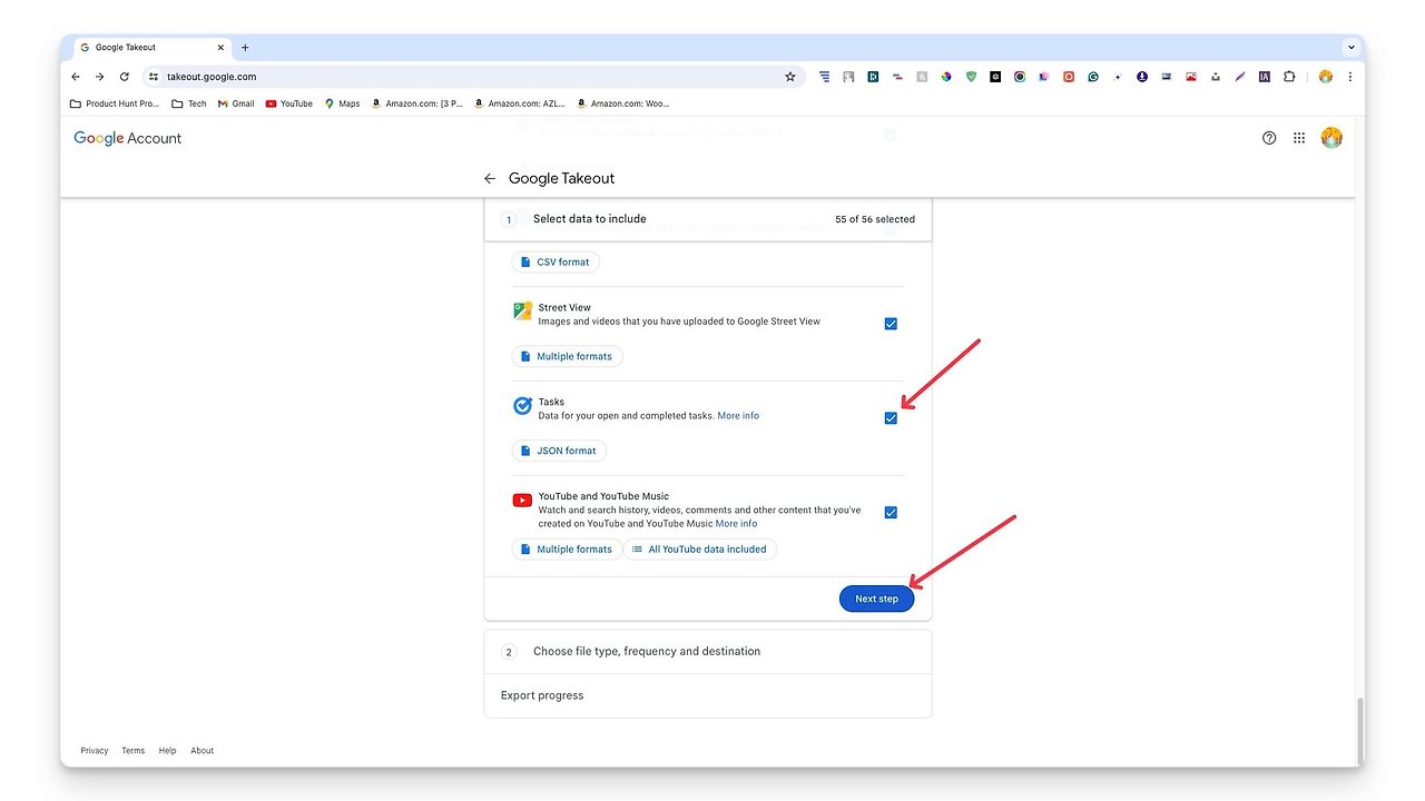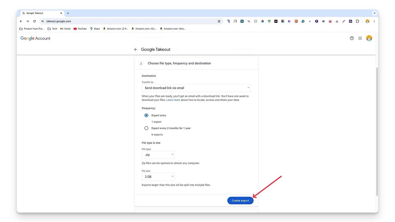 4단계: 자주를 선택한 후 데이터를 한 번 내보내거나 1년 동안 2개월마다 데이터를 내보낼 수 있습니다. 마지막으로 데이터를 내보낼 형식을 선택합니다. 여기에는.zip 및.tgz가 포함되어 있으며 원하는 zip 파일 크기를 선택하세요. 최대 10GB까지 선택할 수 있습니다.