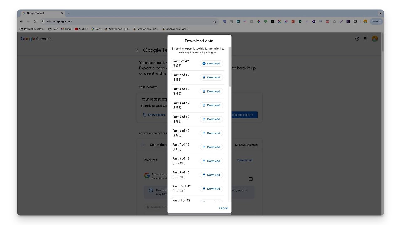 6단계: 데이터 크기에 따라 데이터를 내보내는 데 몇 시간이 걸릴 수 있습니다. 데이터가 준비되면 확인 이메일을 받게 됩니다. 내 경우에는 84.5GB 크기의 55개 Google 제품의 데이터로 구성된 데이터를 내보내는 데 24시간이 걸렸습니다. 파일 크기에 따라 Google은 데이터를 여러 패키지로 나눕니다. 다운로드를 클릭하면 데이터 다운로드를 시작할 수 있습니다.
