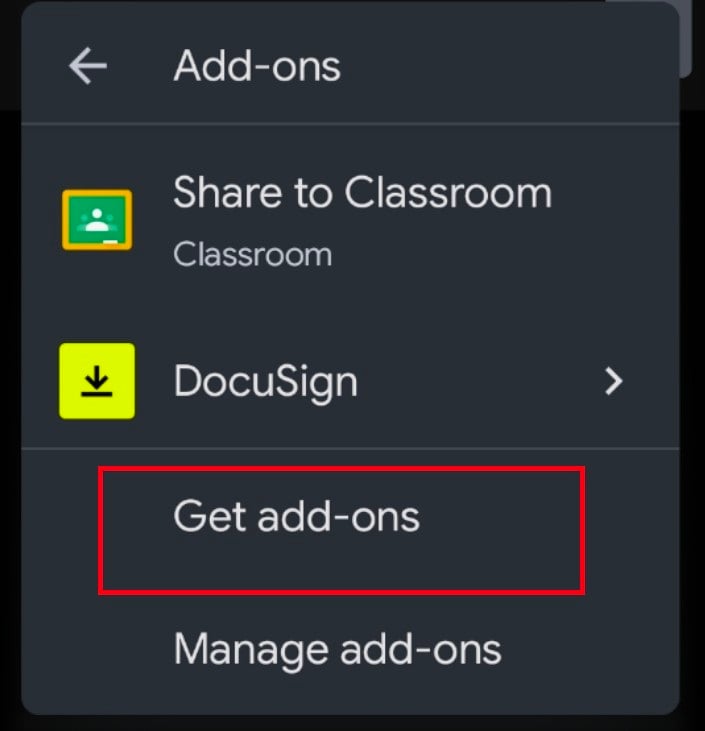 - 그러면 Google Docs Android 앱에서 지원되는 모든 추가 기능이 열립니다. 현재 Google Docs Android 앱에는 3개의 추가 기능만 포함되어 있습니다.