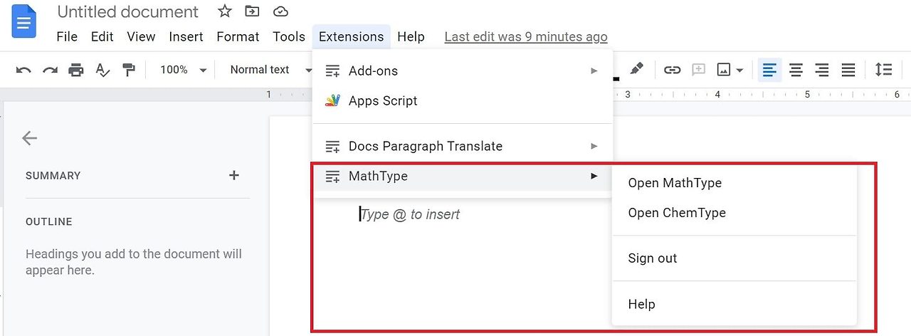 - 빈 Google Docs 시트를 다시 열고 상단 메뉴의 확장 프로그램 탭으로 스크롤합니다.